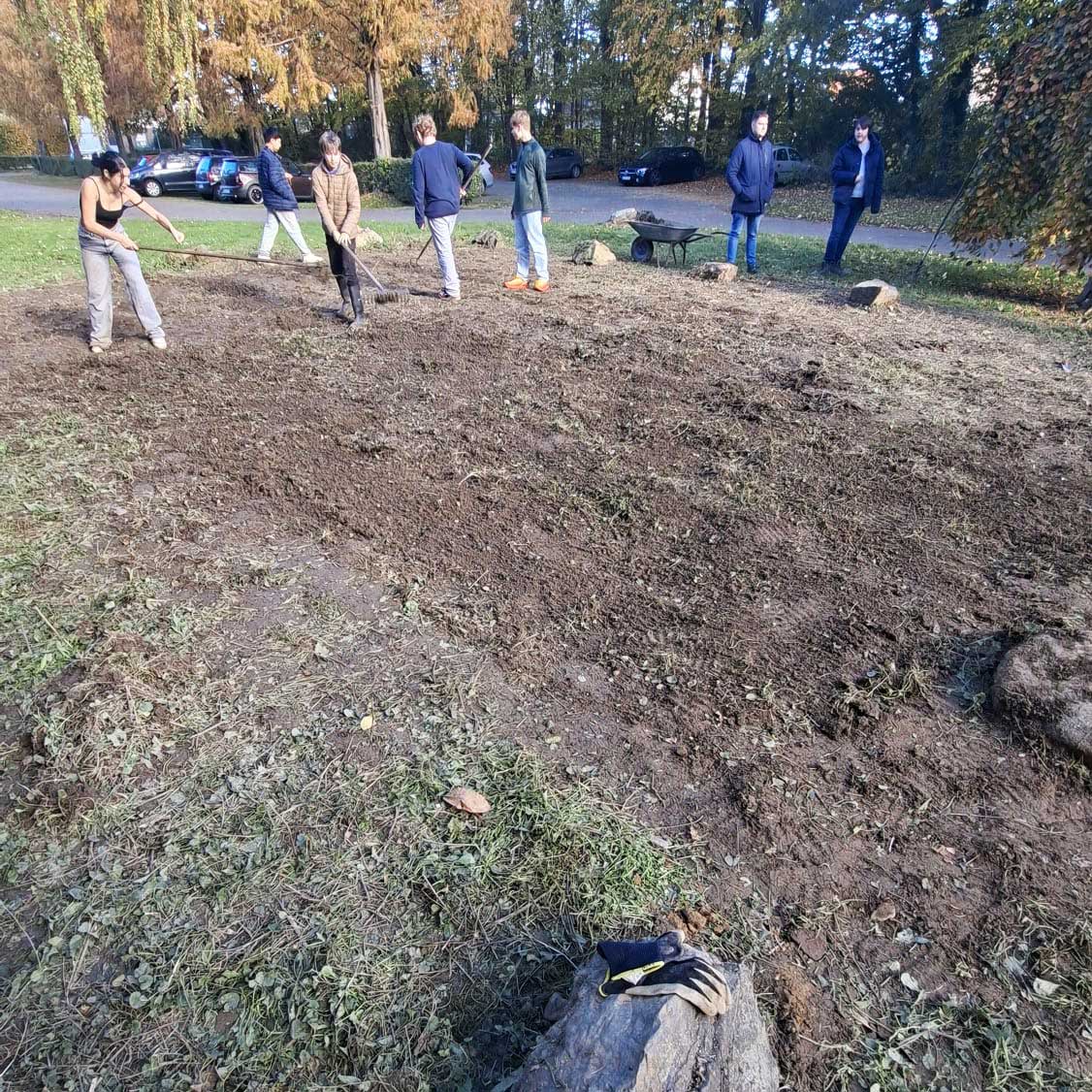 (Inhalt der Fotos: Platz des Igelfutterhaus, Insektenwiese vorher und nach der Bepflanzung – Copyright Julia Billaudelle, Europaschule.)